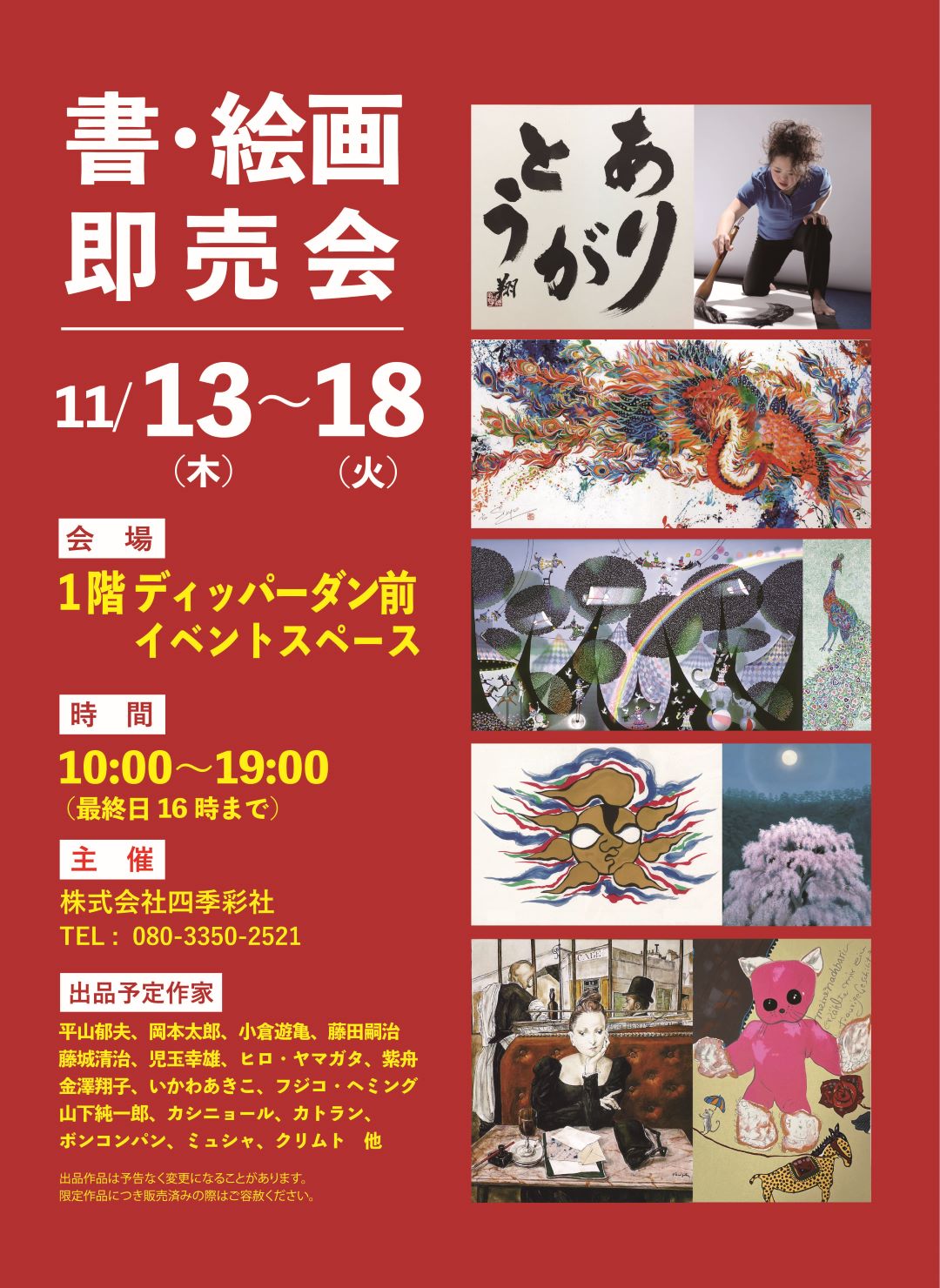| 内容 | 1階ディッパーダン様前 特設会場にて書・絵画販売を行います。 あなただけの特別な一枚を見つけませんか? 皆様のお越しをお待ちしております。 |