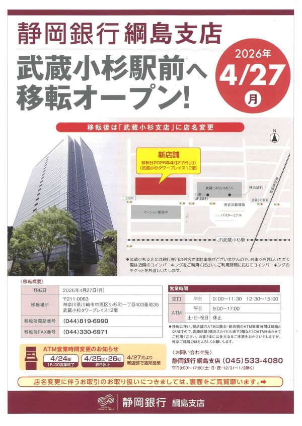 この度、静岡銀行綱島支店は2026年 4 月 26 日 ㊎をもちまして
