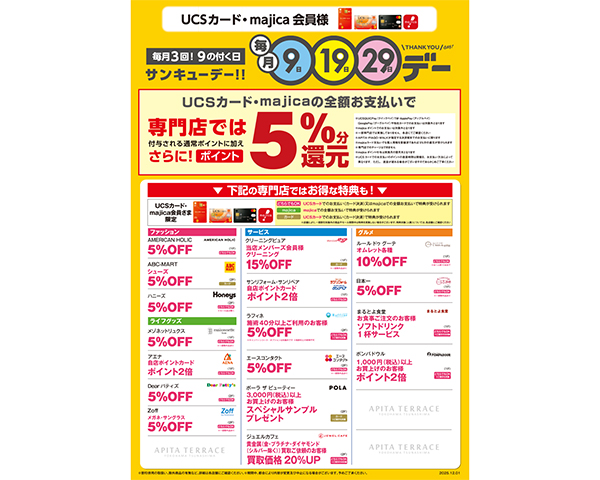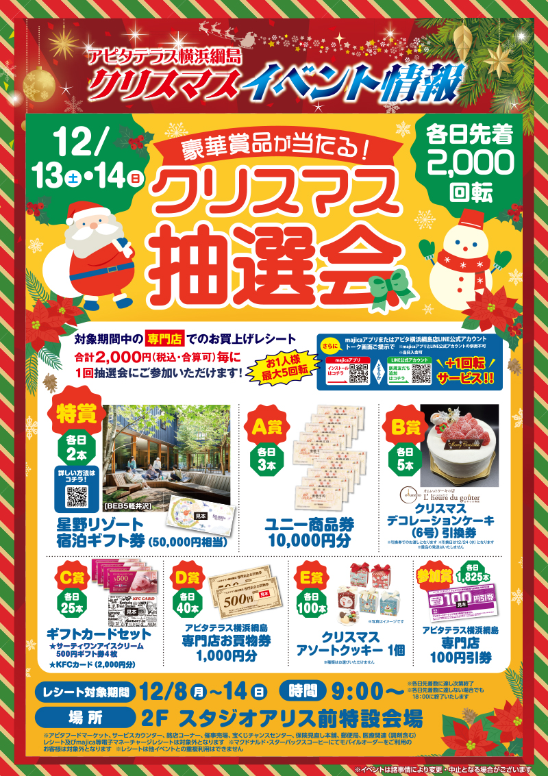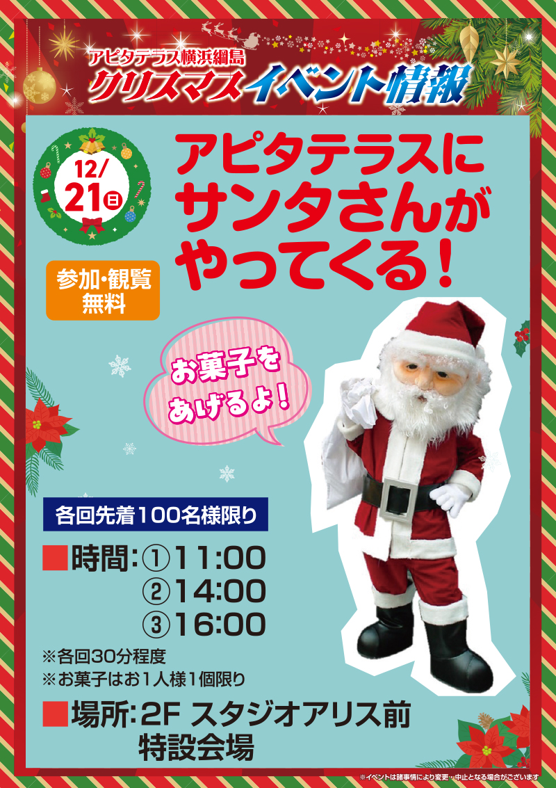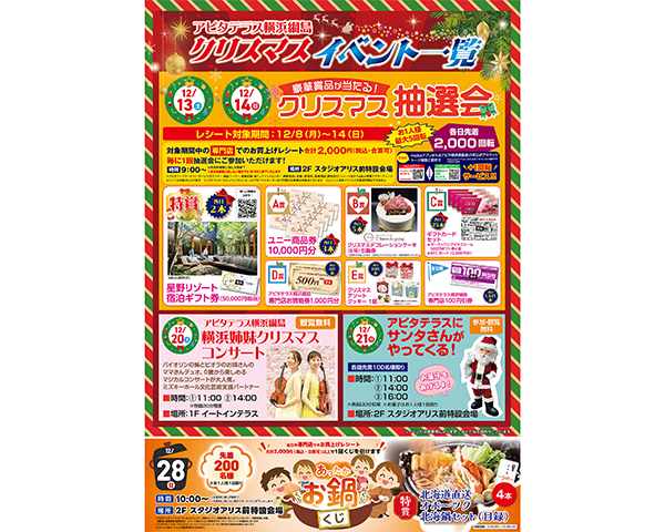 アクセス 施設案内 営業時間 9:00〜22:00 一部専門店は異なります。 WEB CATALOGWEBチラシ チラシを見る チラシを見る チラシを見る チラシを見る WEBチラシ一覧へ EVENTイベント 豪華賞品が当たる!クリスマス抽選会 2025/12/08 アピタテラスにサンタさんがやってくる 2025/12/08 横浜姉妹クリスマスコンサート 2025/12/08 【ワークショップ】ガーランド作り 2025/11/05 12/4㊍~8㊊ 世界の山ちゃん キッチンカーがやってくる!! 2025/11/04 アピタテラス横浜綱島 屋上フリーマーケット 2025/10/11 イベント一覧へ SHOP NEWSショップニュース ブックサンタ2025 受付中です! 2025/12/06 「intelligence metal TITAN」 2025/12/05 【新作】チョコランタン 2025/12/05 【新作】チョコシュークリーム 2025/12/05 【#遠近はじめどき】がんばる目に、遠近両用コンタクトで労わりを。 2025/12/05 【期間限定】きのこパスタ2種 2025/12/05 ショップニュース一覧へ INFORMATIONお知らせ 2階『Dear パティズ』短縮営業につきまして 2025/12/01 【臨時休業】12/2(火)~18(木)2階マクドナルド 改装休業について 2025/11/19 【重要】1階 新宿さぼてん閉店のお知らせ 2025/11/04 【重要】1階 メゾネットリュクス閉店のお知らせ 2025/10/25 お知らせ一覧へ
